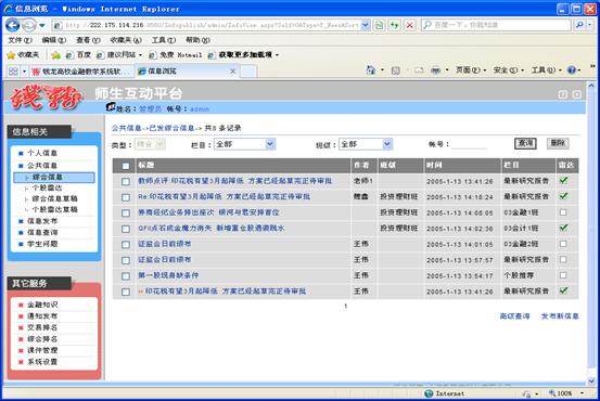 师生之间可通过网络进行文字信息双向交流。教师可以在师生互动平台上自定义主题让学生开展讨论,学生能方便的自由发言交流,通过师生间的信息发布与批示点评实现更好的在线交流。 具备“课件下载”、“通知发布”、“综合评分”等实用功能,系统能根据学生的投资收益、成交活跃度、研究报告的发表数量自动进行综合评分