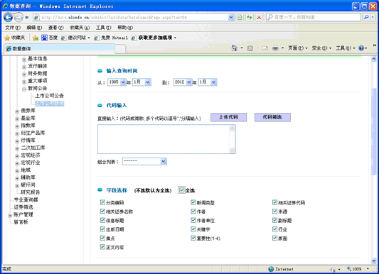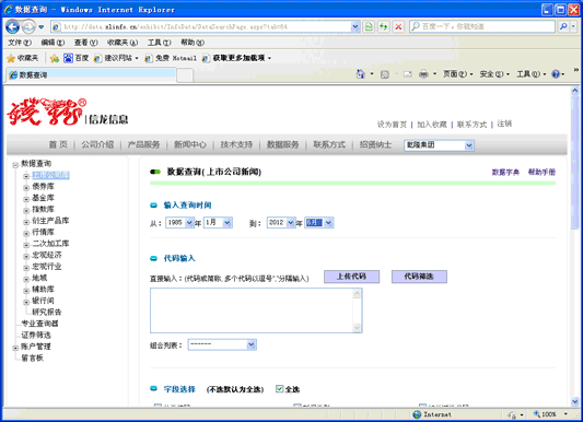 对于类似公告、新闻等重要的文字资料来说,只是数据量的追求是远远不够的,更加重要的是让使用者能根据自己需要的条件方便的检索到所需要的数据。 我们对新闻作了多达12种检索方式,包括标题、作者、日期、行业、栏目、证券代码、关键字、所属专题等等,通过这么多的索引,一条普通的新闻就变成了精加工之后的数据。