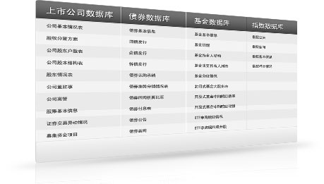 数据库把上市公司披露的一切资料都作为搜集的对象,基本库中包含了150张表格,中间库超过200张,在最终的产品库中合理地缩为83张表格,内容上不仅有基本资料、财务数据、分红扩募、新闻公告等基本部分,还包括了公司的资产重组、风险揭示、经营重大事项等数据的全面整合。